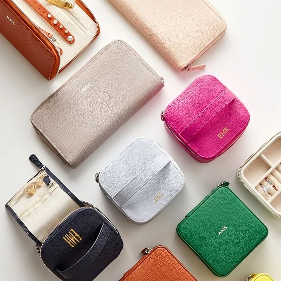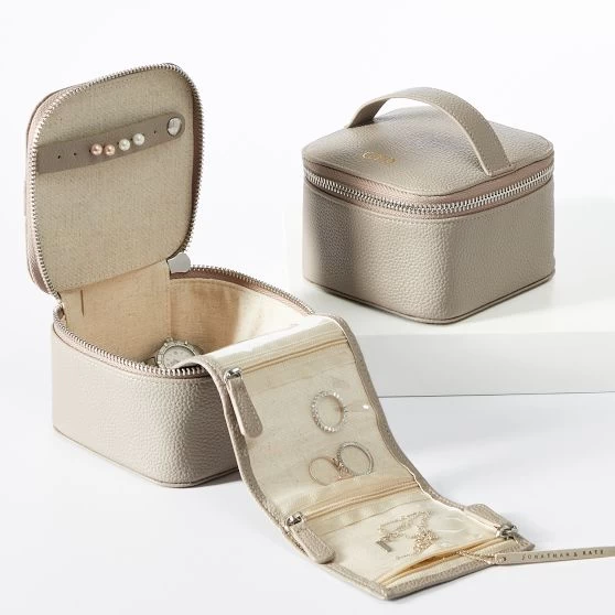 A quality way to store jewelry and a thoughtful gift for anyone on your list. Features a fold out strip with four clear zippered compartments designed to keep your jewelry tangle-free and easy to see. There’s space under the fold out strip for larger pieces like bangles and a tab above with room for four pairs of earrings. Crafted from high quality pebbled vegan leather, you can enhance the design with a custom monogram.