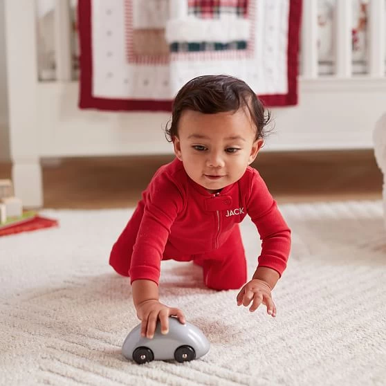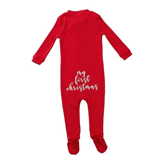 This traditional red onesie and matching hat is the perfect set to celebrate your little snuggle bug’s first Christmas. Woven from a super soft organic cotton with a zipper front that make changing a breeze, this set is embroidered with “my first Christmas” and can also be embroidered with your baby’s first name for a special touch.