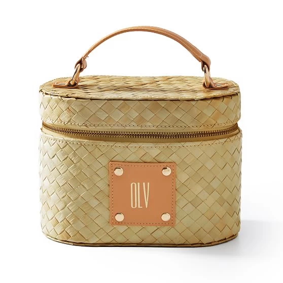 Handwoven from natural palm leaf with tan leather detailing and a soft linen lining, this top handle bag is a stylish companion for any occasion. Whether displayed on a vanity or carried on-the-go, it’s perfect for keeping makeup and small essentials safely stowed. Customize this carry case with a classic monogram for a personal touch.