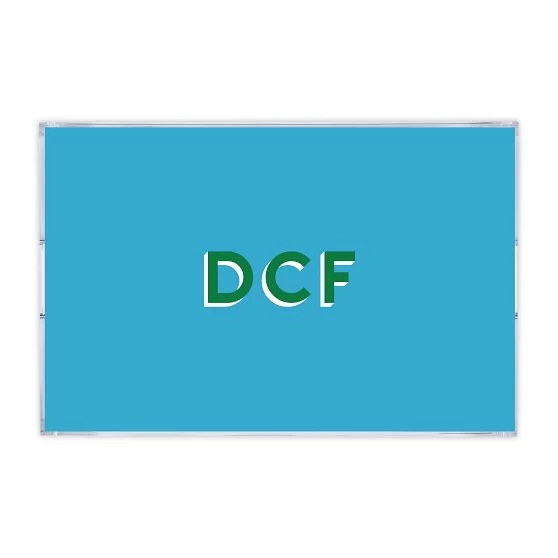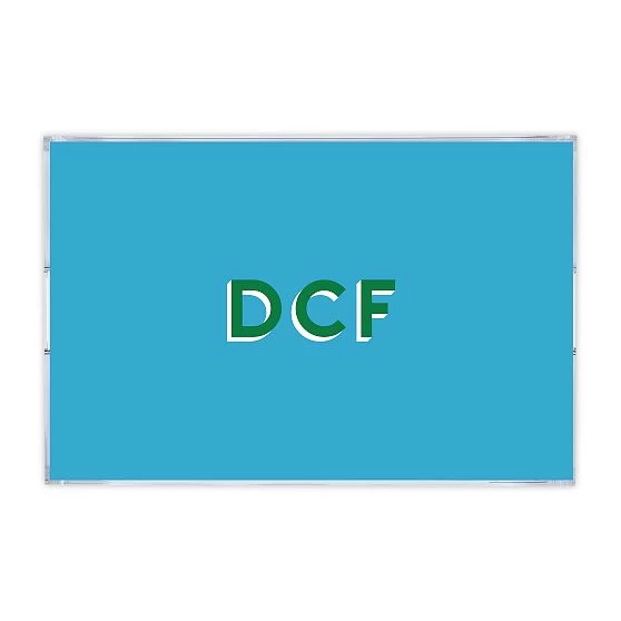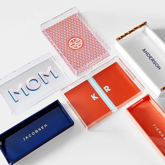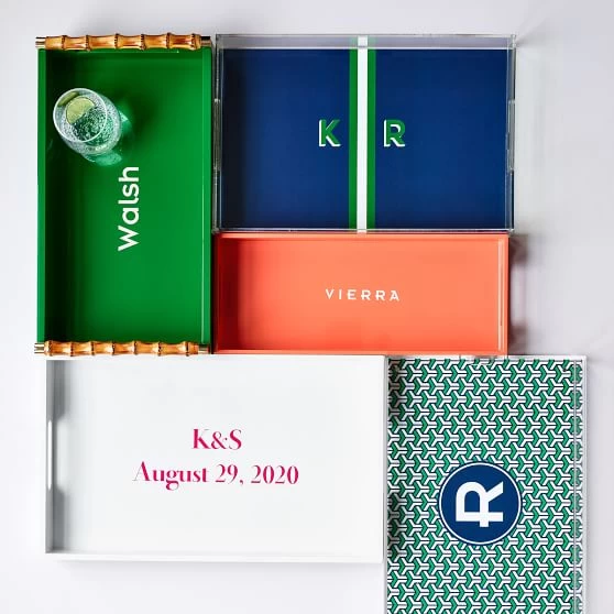 Handcrafted from durable Lucite with integrated handles, these clear trays feature colorful patterned paper inserts designed by local artists. Add a digitally printed monogram to the design for a personal touch.