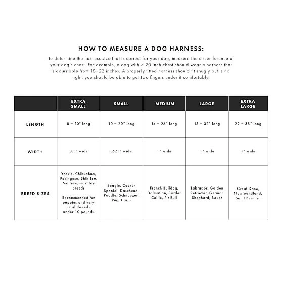 • To determine the harness size that is correct for your dog, measure the circumference of your dog’s chest. For example, a dog with a 20-inch chest should wear a harness that is adjustable from 18-22 inches. A properly fitted harness should fit snugly but is not tight; you should be able to get two fingers under it comfortably.