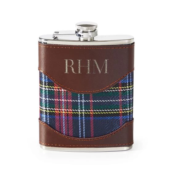 A classic gift designed in the spirit of the season, this flask is made from durable stainless steel wrapped in plaid twill and premium leather. The curved silhouette fits easily in your jacket pocket for discreet sipping. Add a monogram for a thoughtful one-of-a-kind gift.