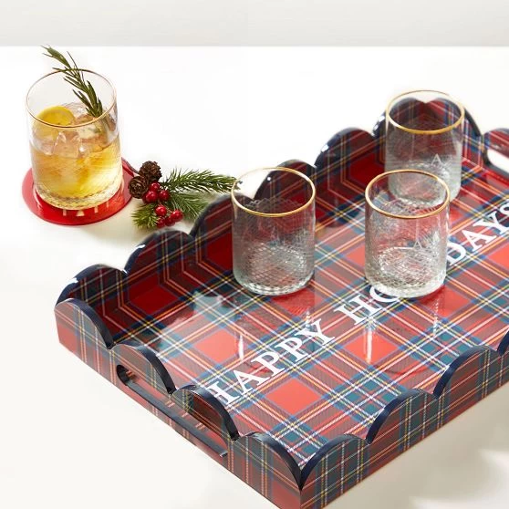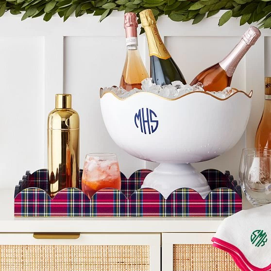 Beautifully scalloped edges with high gloss lacquer finish and sleek built-in handles – these are the design details that add beauty and depth to this versatile tray. Designed to sit beautifully on your bar cart, organize books on your coffee table or serve your favorite festive appetizers. Add a decal name or monogram for a personal touch.