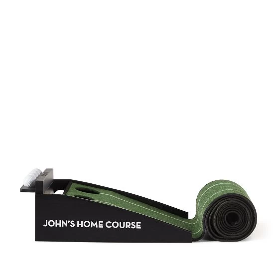 Take your short game to the next level today with the Practice Putting Mat. The 9 ft putting surface is engineered to roll like a typical putting green with options to putt to a small or medium size cup depending on your desired level of difficulty. The putting surface includes set positions ranging from 2 feet to 9 feet so you can build muscle memory for varying putt lengths. The guides at each putting position help ensure correct alignment and accuracy. The ramp is crafted using premium black painted wood with a timeless design to look great for any home or office. Add a monogram to the wood base for a personal touch.
