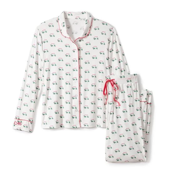 The perfect pajamas for the holiday season, this playful printed set can be embroidered with a monogram for a thoughtful gift that will keep her cozy all winter long. The set is made from beautifully soft rayon that will get softer with every wash and a blend of spandex for the perfect amount of stretch. Perfect for lounging, the classic cut features navy piping, pearlized buttons, and French cuffs, while the long pants have a drawstring closure for extra comfort.