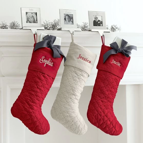 We’ve updated our classic stocking with a quilted pattern in 100% linen and beautiful embroidery on the cuff. Hang the winter design on a fireplace with a simple garland for a clean, elegant look or wrap one up as a present.