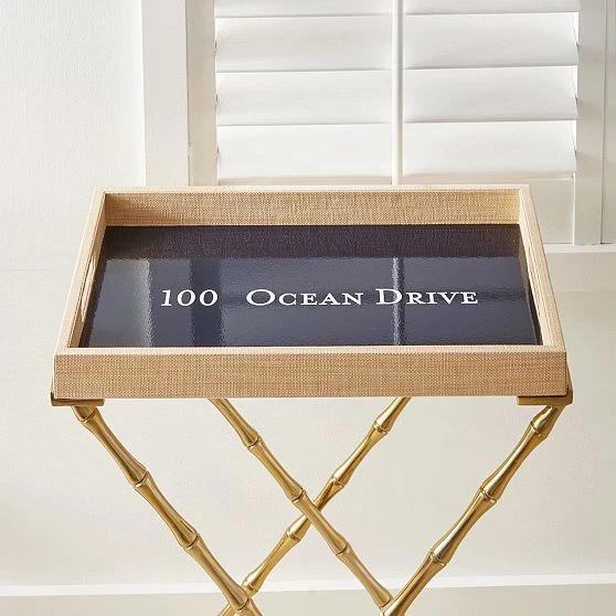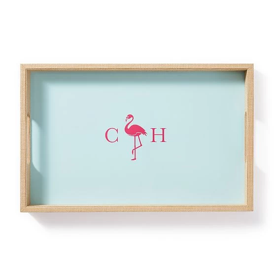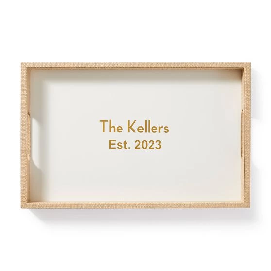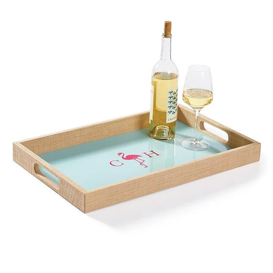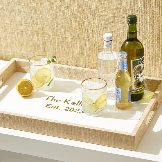 Serve up classic coastal style with this beautiful tray, wrapped in a durable and water resistant raffia-like material inspired by warm weather getaways. With a lacquer base for both an elevated look and easy cleanup, it also has a suede-lined bottom that won’t scratch delicate surfaces and cutout handles for easy carrying. Perfect for putting a tropical touch on cocktail hour or as a stylish way to organize cosmetics on your vanity. Add a name or a monogram to make it one-of-a-kind.