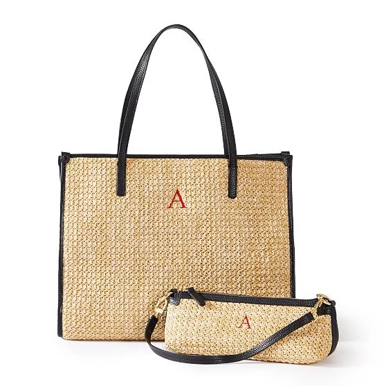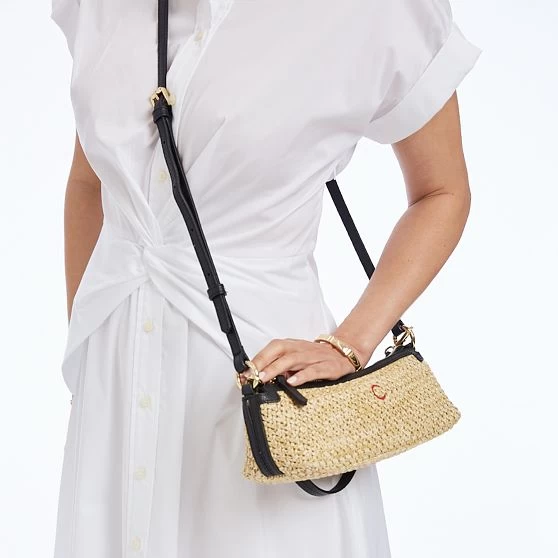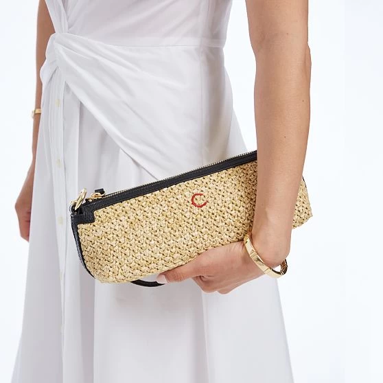 Three bags in one, this petite convertible bag can go from over your shoulder to a crossbody to a wristlet in a snap. Simply clip on the included adjustable crossbody strap or top handle strap in the desired configuration, or remove both for a sleek clutch. This versatility makes it ideal for traveling light when you want one bag to work for multiple outfits and occasions. Crafted from raffia and trimmed in fine pebbled leather, its linen lined interior can accommodate larger smartphones, as well as smaller essentials in a zippered pocket. Add an embroidered monogram for a personal accent.
