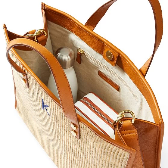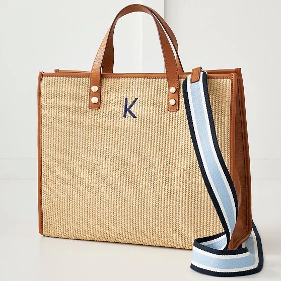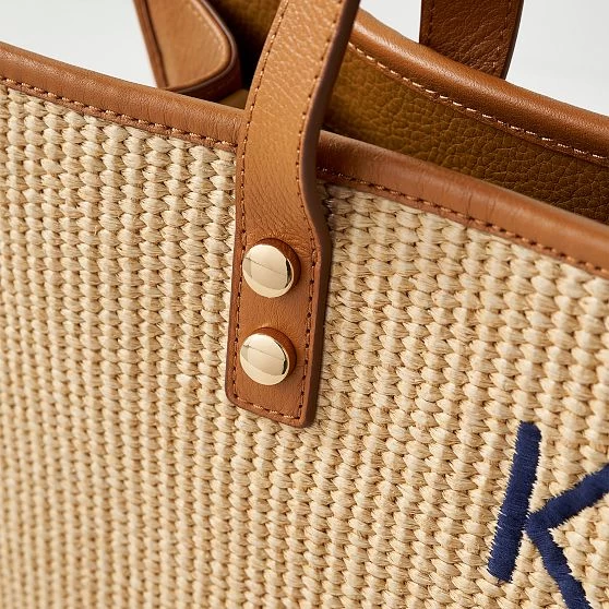 Crafted from a durable raffia-inspired fabric and high quality leather, our Essential Raffia Tote features a spacious, open-tote design with leather carry handles and an adjustable leather crossbody strap that can be swapped out for one of our colorful straps to create your own style. Add an embroidered monogram to add a personal touch to your new everyday tote.