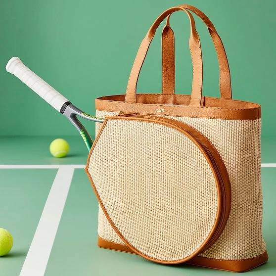 A tennis tote with the soul of a designer bag, we crafted this carryall out of a woven material inspired by raffia grasscloth and trimmed it in vegan leather. The interior is lined in linen, with all the pouches and pockets you would expect in your favorite luxury tote, including a place to slip your phone and a zipper pocket for smaller items. As spacious as it is stylish, it has plenty of room for your courtside essentials. Be the envy of your local racquet club or give to your doubles partner as a stunning gift. Add a monogram for an extra special touch.
