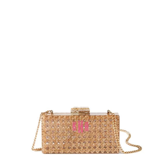 The coastal charm of rattan latticework meets the sleek durability of acrylic in this unique hardshell clutch. Made for summer nights out, this clutch is deep enough to accommodate larger smartphones along with a few small evening essentials. Can be worn as a crossbody or a clutch, with a gold chain attached to foldaway tabs. Add a custom monogram for a particularly stunning gift.