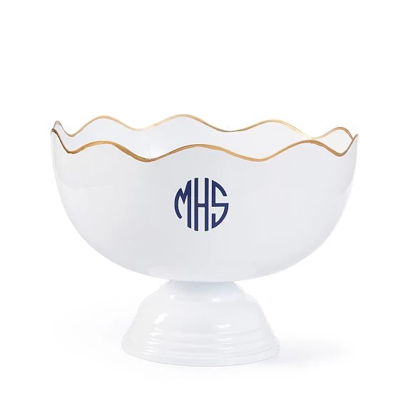 A stylish centerpiece for your next party, fill this oversized bowl with ice and your favorite beverages. Made from enameled metal and with a charming hand-painted scalloped edge, it’s both durable and attractive. Add a name or a monogram for a personal touch or to commemorate a special event.