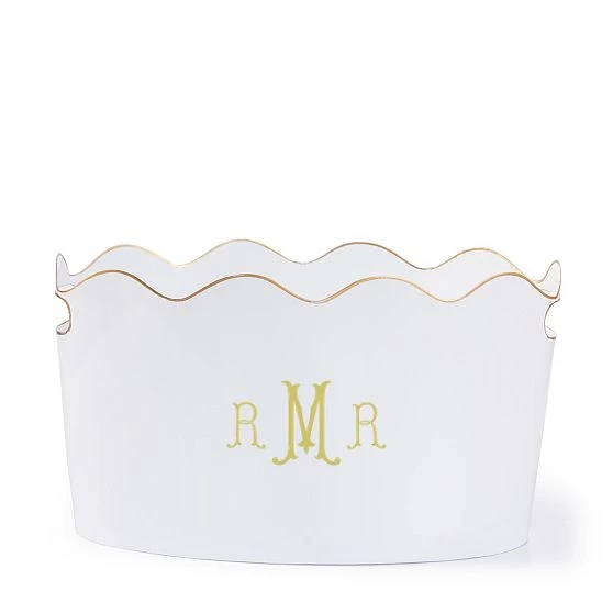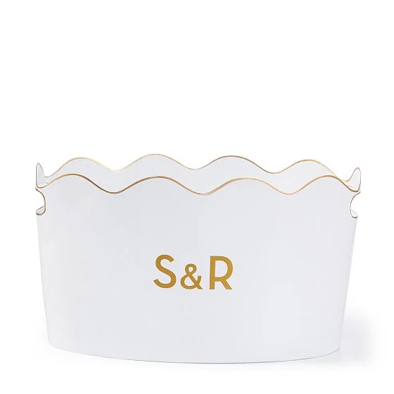 This large wine bucket is the perfect place to chill your prosecco or pinot grigio. Equal parts durability and décor, it is made from enameled metal with a charming hand painted scalloped rim. The bucket also has carry handles for easy transport. Add a name or a monogram to put a personalized touch on your next celebration.