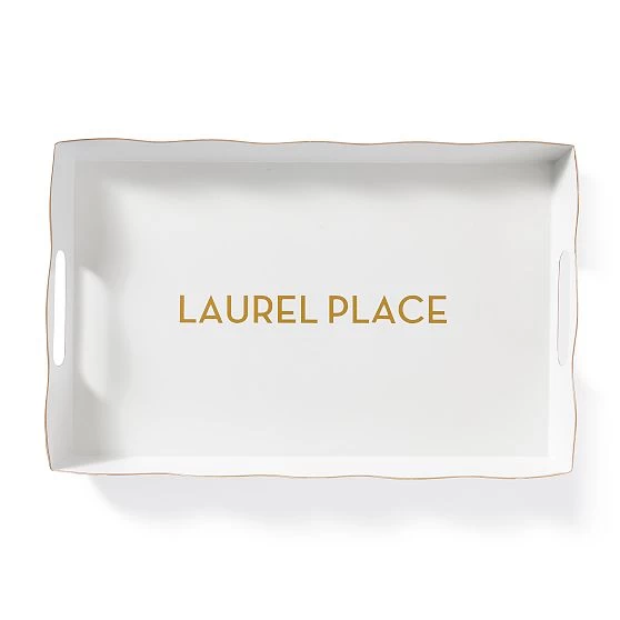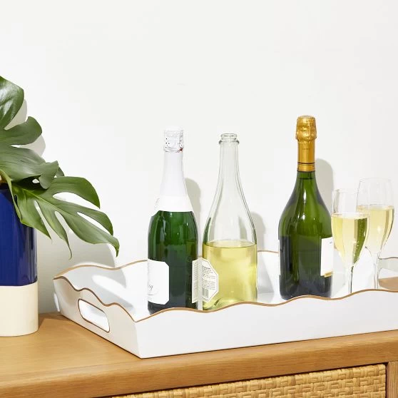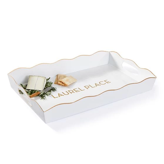 A charming way to serve refreshments or style your sideboard. Made from enameled metal, this tray is both durable and attractive, with a hand-painted scalloped edge and carry handles for easy transport. Add a name or a monogram to put your own mark on the design.