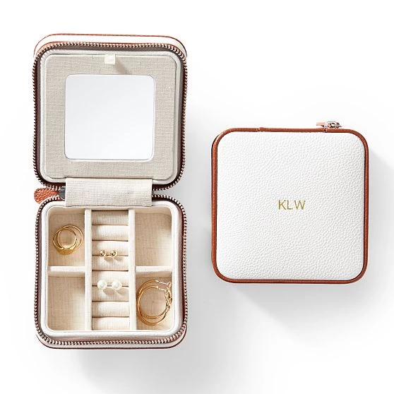 Beautiful and functional, the travel jewelry case is perfect for organizing jewelry at home or away. Thoughtfully designed with cushioned storage for rings, multiple compartments for earrings and necklaces and a mirror for getting ready on the go. Just the right size for a weekend away or when you only want to pack your most-loved pieces, this square zippered case is our most popular gift with textured vegan leather and a soft linen lining.