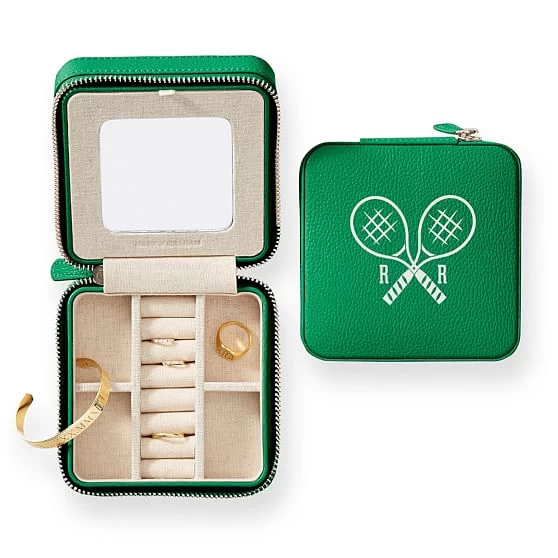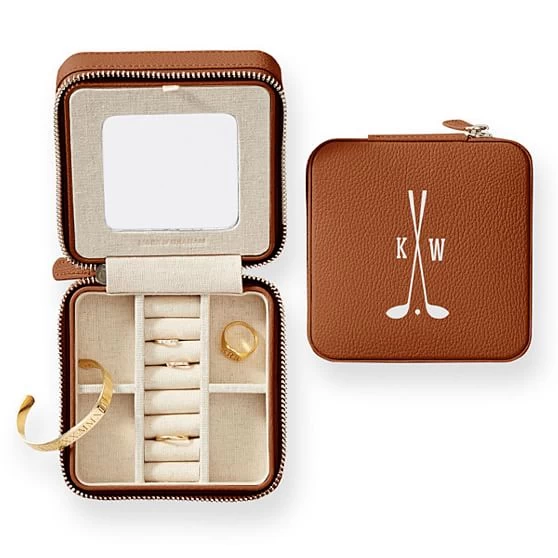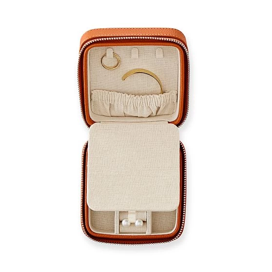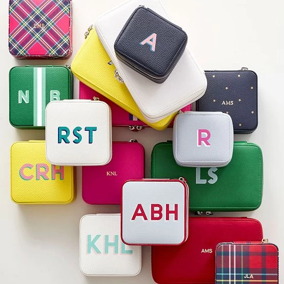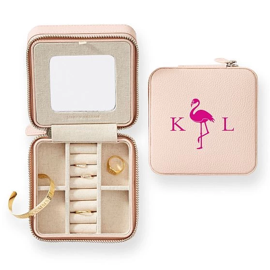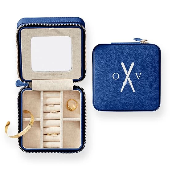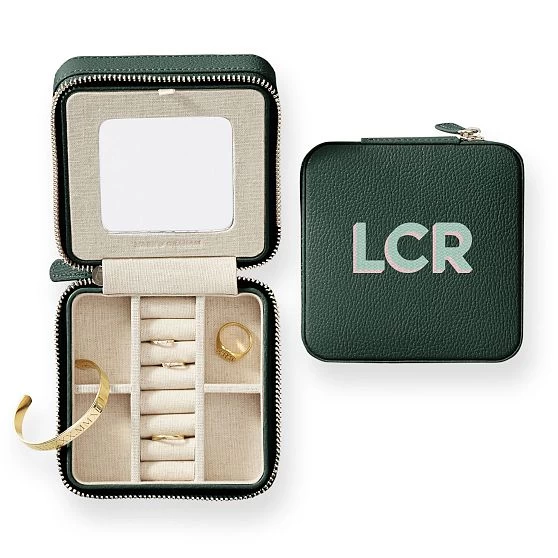 With a stunning shadow printed monogram, this square zippered case makes the perfect travel gift for her. Made from a durable textured vegan leather with a soft linen lining, our best selling travel jewelry case features multiple compartments to organize earrings, bracelets and necklaces.