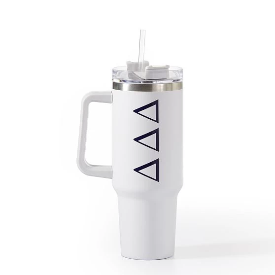 Stay hydrated all day long and represent your house all over campus with this oversized insulated tumbler. Features a handle for easy carrying and three lid positions: an opening for the included straw, a wide mouth for big gulps and a full cover top to prevent spills. Makes a stylish and thoughtful gift for any sorority sister.