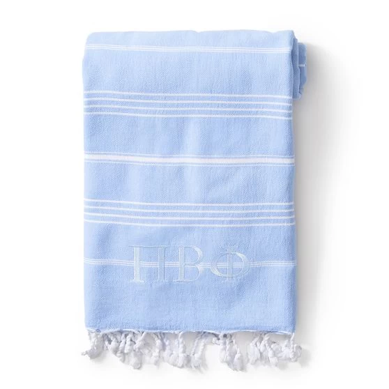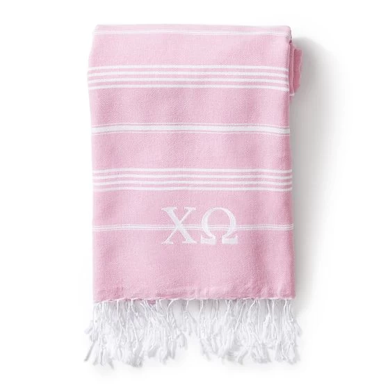 Your favorite new accessory for beach days, poolside lounging or trips to the lake, complete with your house’s letters front and center. Made from 100% cotton, it can be used as a personal beach blanket, a wrap or even a light throw. Features a striped design accented by a knotted fringe border. Makes a great gift for spring break or any sunny sisterhood event.