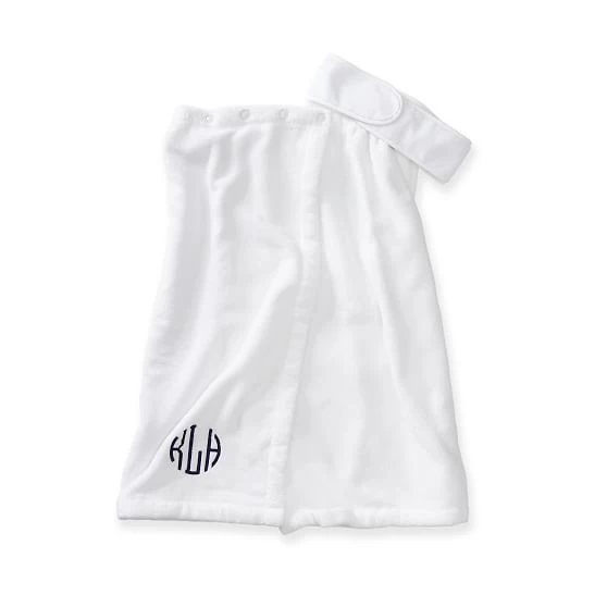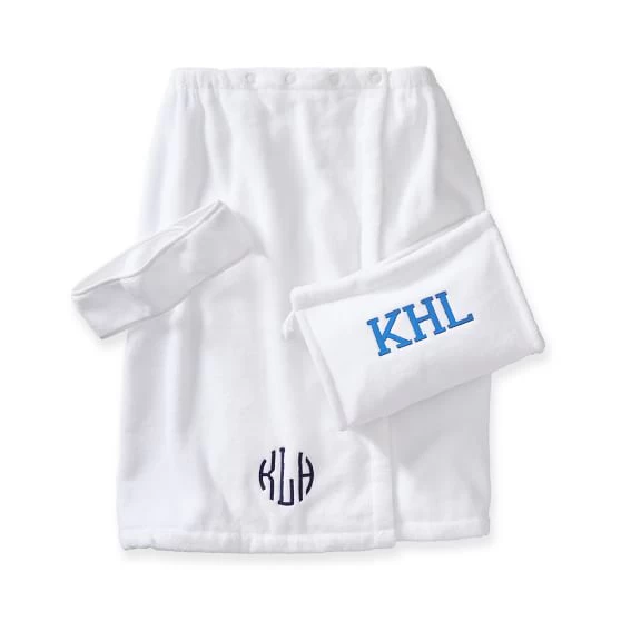Give the gift of self-care with this luxe spa set. Made from a super-soft blend of Turkish cotton, this post-shower set includes a towel wrap with an elasticized top band and snap buttons, a head wrap with a Velcro closure to keep hair out of your face while cleansing or applying makeup and an easy to clean and completely spill-proof cosmetics pouch. Add embroidered initials for an extra-special touch.