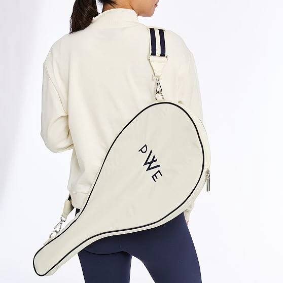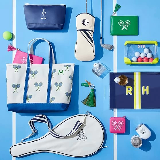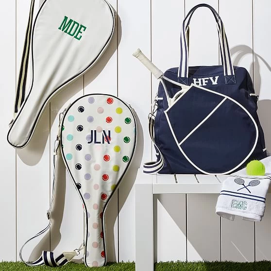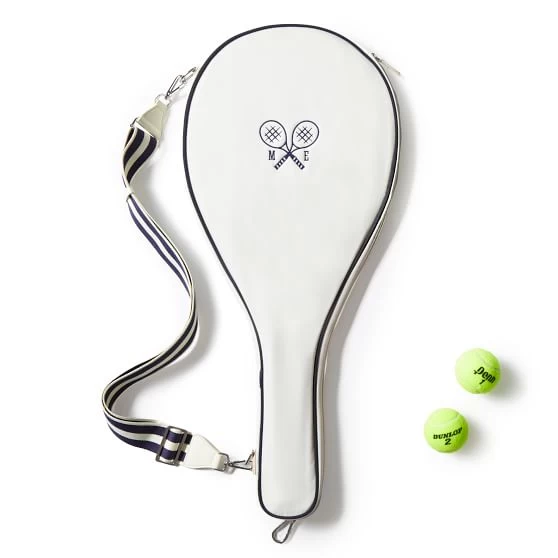 Meet your new courtside companion. This tennis racket cover aces style and functionality. It’s crafted from wipeable nylon with sporty piping details and features a zipper pocket to keep your necessities organized. Designed to fit most standard size rackets, it also includes an adjustable strap so you can take your game to-go comfortably. Add a personalized monogram to really be a standout on the court.