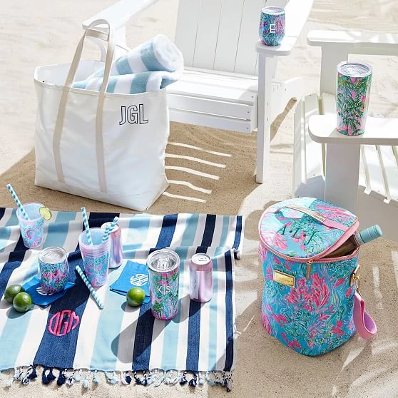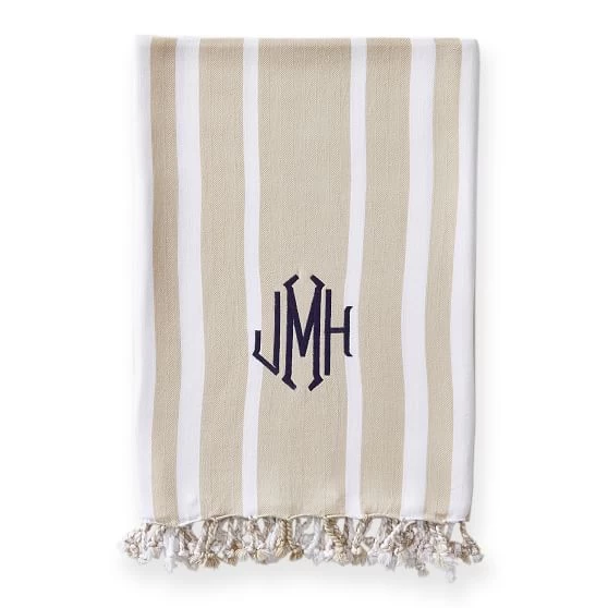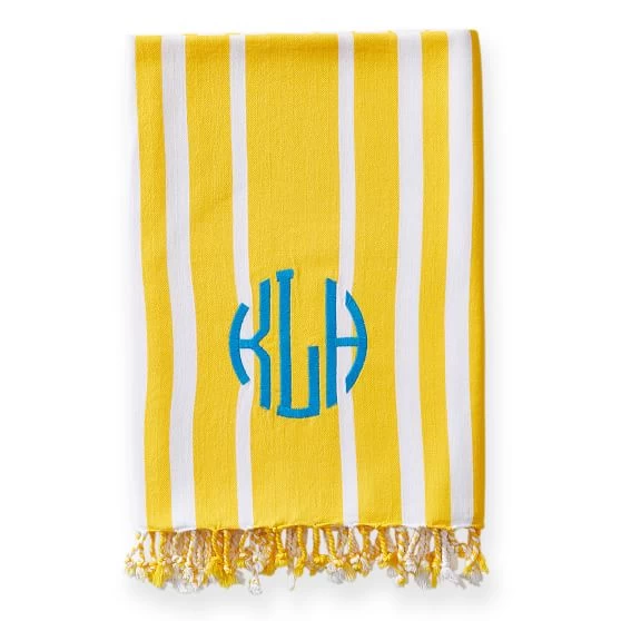 Our Striped Turkish Lightweight Towel is our favorite new accessory for beach days, poolside lounging or as an extra layer at home or the office. Woven from 100% pure Turkish cotton, this oversized towel can be used as a beach blanket, a wrap or as a light throw, and features a reversible, striped design with a knotted fringe border and an embroidered monogram for a personal touch.