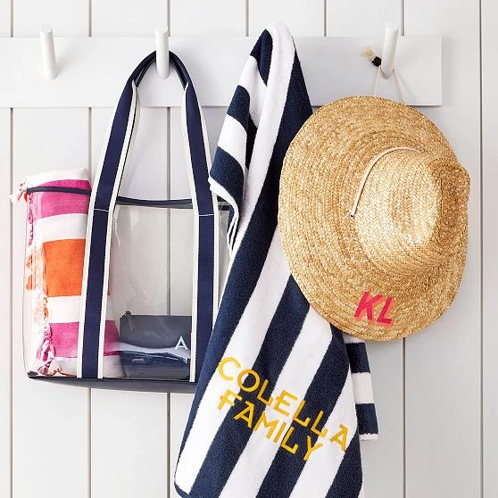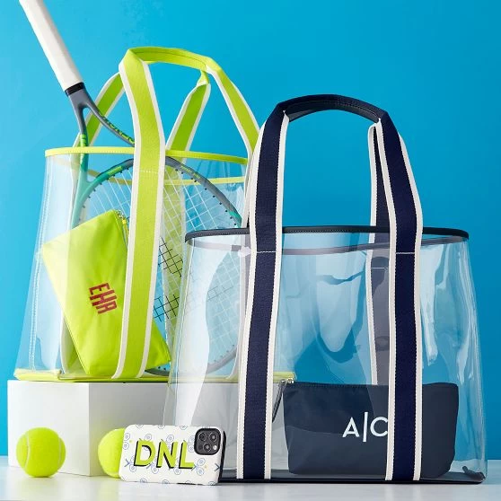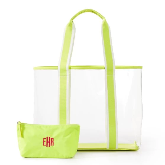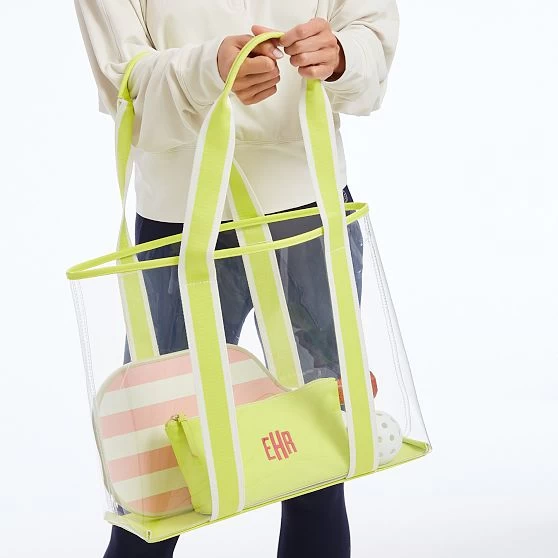 Access all your summer essentials at a glance with this spacious clear tote, designed for everything from beach days and boat days to tennis matches and yoga class. Constructed from sturdy and easy-to-clean plastic and durable nylon, it comes with a coordinating zipper pouch to keep smaller items organized. The see-through construction makes it a great option for stadium events and festivals. Add a monogram to the included pouch for a custom touch.