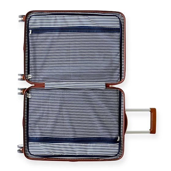 • Polycarbonate exterior, genuine leather detailing, striped polyester lining.