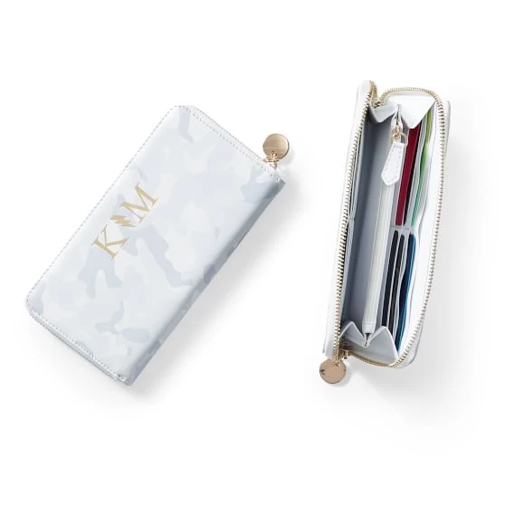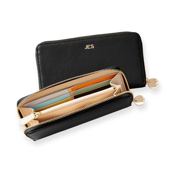 An everyday essential. This classic design has everything you could wish for in a wallet; 12 credit card slots, 2 billfolds, a middle zip pocket and a variety of colors to choose from. Crafted from leather with a zip-around closure and a gold disk pull to keep daily essentials secure. Add a custom foil debossed monogram for a personal touch