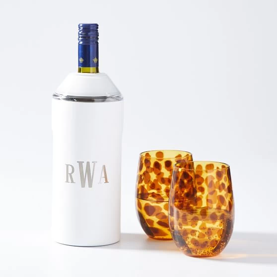 Keep your bottle of wine or champagne chilled for hours without the mess of ice with this portable wine chiller from Vinglacé. It’s crafted from double-walled, vacuum-insulated stainless steel. Simply open and place your chilled bottle inside to keep cold on the go. Choose a custom monogram to make a personal statement while you sip.