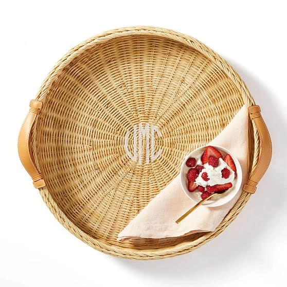 Artfully woven by hand from sun-warmed wicker, this stunning tray is designed to make summer entertaining a breeze. Perfect for serving your favorite snacks and cocktails or for organizing your bar cart and coffee table, this versatile tray features a clear acrylic insert and reinforced tan leather handles.