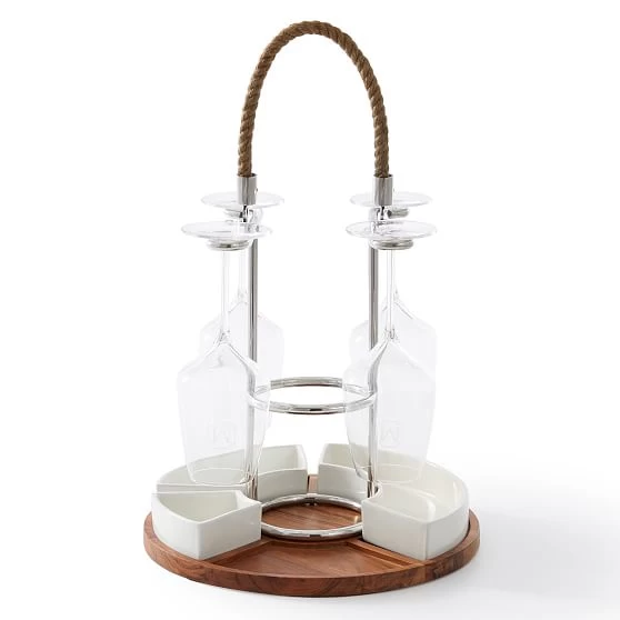 Serve perfect pairings with this dual wine and appetizer caddy. With a place for your bottle and three ceramic dishes for snacks, it’s got everything you need for delicious entertaining. Crafted from durable stainless steel with an acacia wood tray base, it features a rope handle for easy transport to the table.