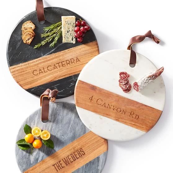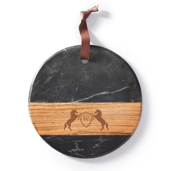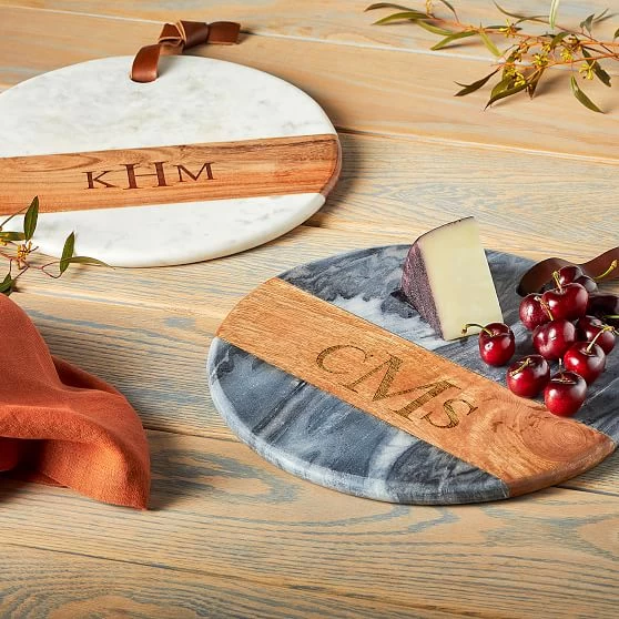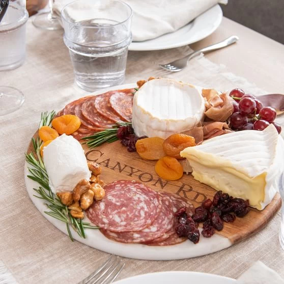 A simple round design with beautiful materials: display your delicacies with personalized style, in cool marble and warm acacia wood. This sleek tray makes the perfect perch for brie or chevre, manchego or gouda – create your favorite cheese plate. Made overseas, these unique products are created by a socially responsible company dedicated to the principles of fair trade and equal opportunity. They work with family-run businesses and cooperatives that treat workers fairly and with respect. Each cheese board is unique due to the natural variations of the acacia wood and the marble.