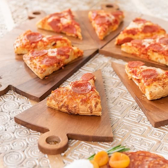 Take your pizza nights to the next level with this pizza party serving board. Handcrafted from Fair Trade-certified solid arjun wood and treated with a food-safe, natural oil-based finish, this serving board makes grabbing a slice at pizza parties a breeze—the rounded handles make each ‘plate’ easy to pull out and hold. Add an engraved monogram to this unique piece for the perfect gift for the pizza lover.